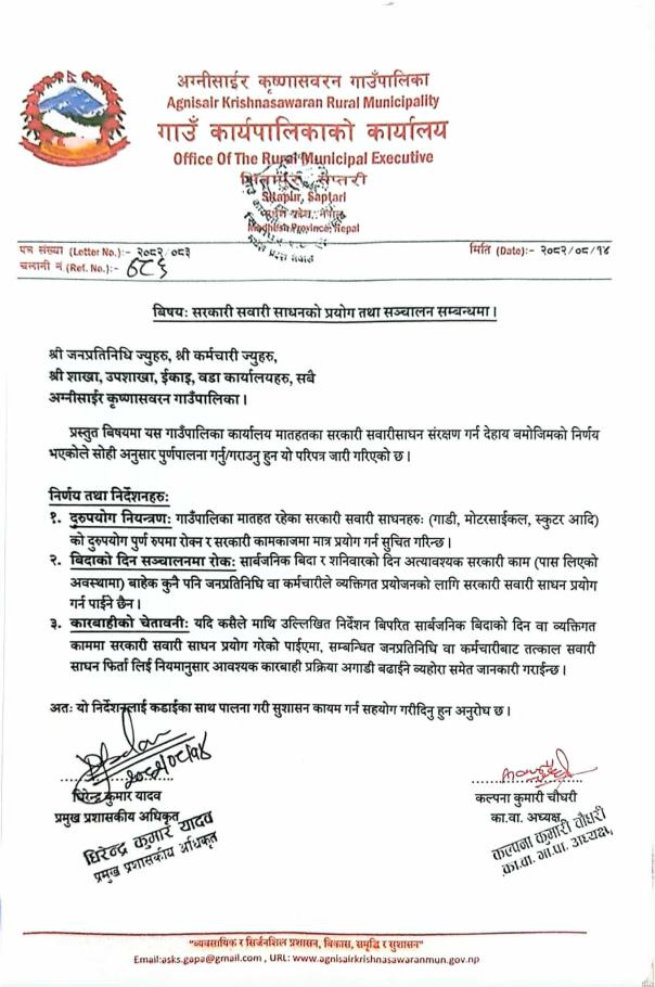 सरकारी सवारी साधनको प्रयोग तथा सञ्चालन सम्बन्धी पत्र