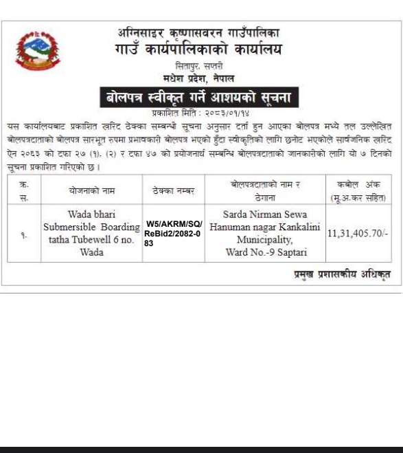 » वोलपत्र स्वीकृत गर्ने आशयको सूचना