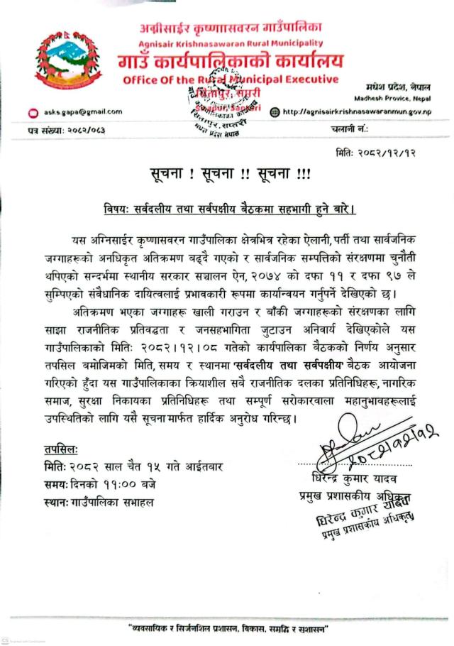 सर्वदलीय तथा सर्वपक्षीय बैठकमा सहभागी हुने बारे सूचना ।