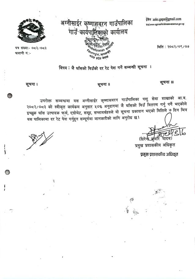 ५० प्रतिशत अनुदानमा जै घाँसको विउँ माँग गर्ने सम्बन्धी सूचना