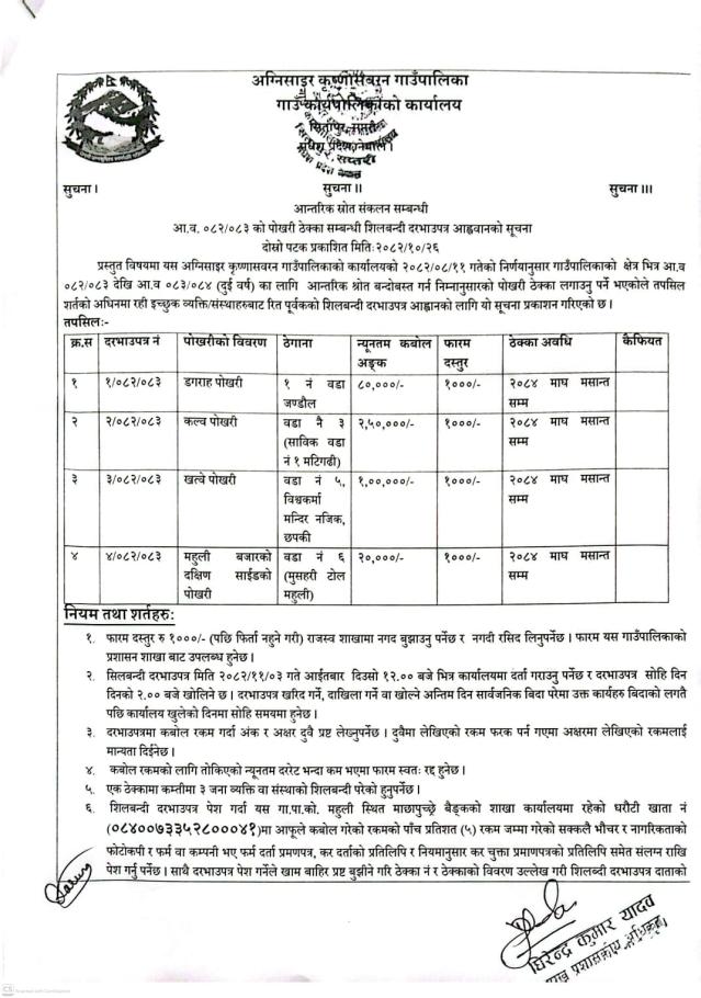 आन्तरिक स्रोत संकलन सम्बन्धी आ.व.०८२/८३ को पोखरी ठेक्का सम्बन्धी शिलबन्दी दरभाउपत्र आह्रवनानको सूचना ।