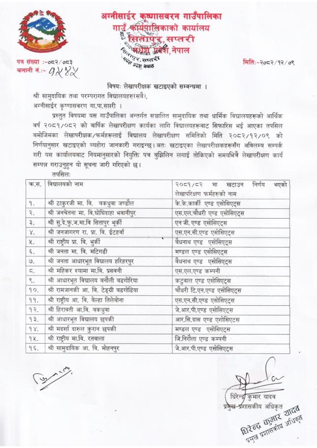 विद्यालयहरुमा लेखापरीक्षक खटाइएको सम्बन्धमा