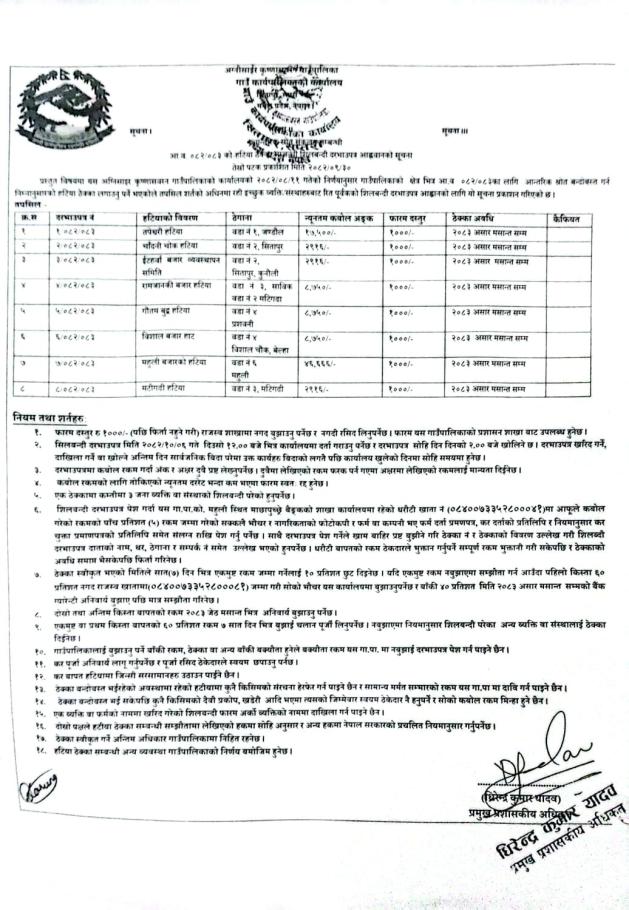हटिया ठेक्का सम्बन्धी शिलबन्दी दरभाउपत्र आवह्रानको सूचना(दोस्रो पटक प्रकाशित)