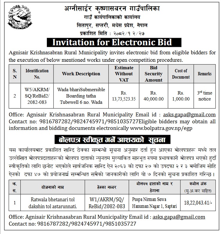 Invitation for Electronic Bid र बोलपत्र स्वीकृत गर्ने आशयको सूचना