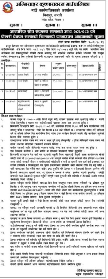 » आन्तरिक स्रोत संकलन सम्बन्धी आ.व.०८२/८३ को पोखरी ठेक्का सम्बन्धी शिलबन्दी दरभाउपत्र आह्रवनानको सूचना ।