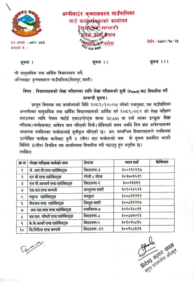 » श्री सामुदायिक तथा धार्मिक विद्यालयहरु सबै, विद्यालयहरुको लेखा परीक्षणका लागि लेखा परीक्षकको सूचीबाट सिफारिस गर्ने सम्बन्धी सूचना ।