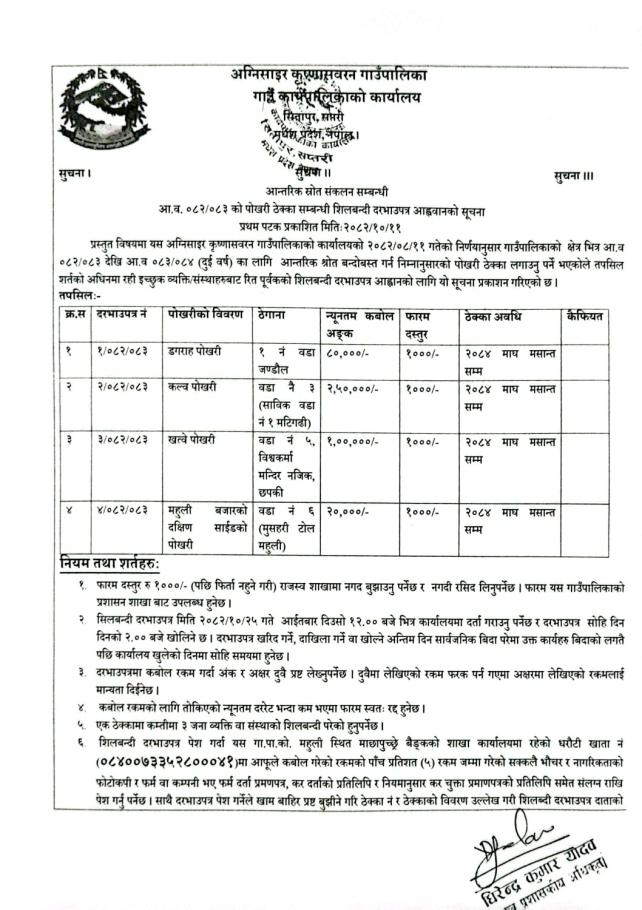 आ.व.2082/83 को पोखरी ठेक्का सम्बन्धी शिलबन्दी दरभाउपत्र आह्रवानको सूचना प्रथम पटक प्रकाशित मिति 2082/10/11