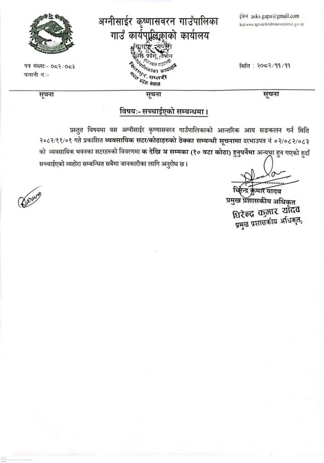 आन्तरिक स्रोत संकल सम्बन्धी व्यवसायिक सटर/कोठाहरुको ठेक्का सम्बन्धी सूचना